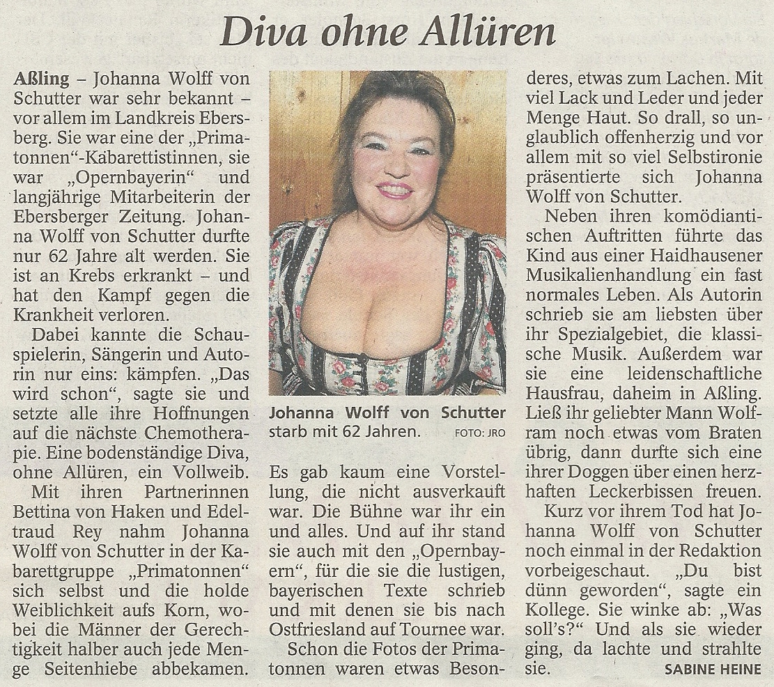 Dieses Datum war der Grundstein für eine langjährige und ereignisreiche Spielzeit mit vielen weiteren „bayerischen“ Operntexten von Johanna Wolff von Schutter, Peter Seitz und Musikarrangements von Herbert Schmelzer. Johanna schaffte es immer wieder auf’s neue Ihr Publikum mit Ihrer lebenslustigen und fröhlichen Aura, in Verbindung mit Ihren Musiker- und Sprecherkollegen, zu begeistern. Seit dem Gründungszeitpunkt lenkte Sie mit Ihrer langjährigen Freundin und Mitbegründerin Gabriele Prediger die Geschicke des Ensembles im Duett. Johanna, wir werden Dir ein ewiges Andenken bewahren. Du hinterlässt eine große Lücke bei "Deinen" Opernbayern. Mit Deiner Kraft und Inspiration hast Du uns gezeigt, wie wichtig es Dir ist, dass die Texte, die Musik und die Begeisterung in Deinem Sinne weiterleben. Unser aller Gedanken begleiten Dich in den ewigen Frieden.